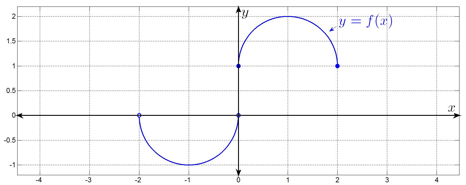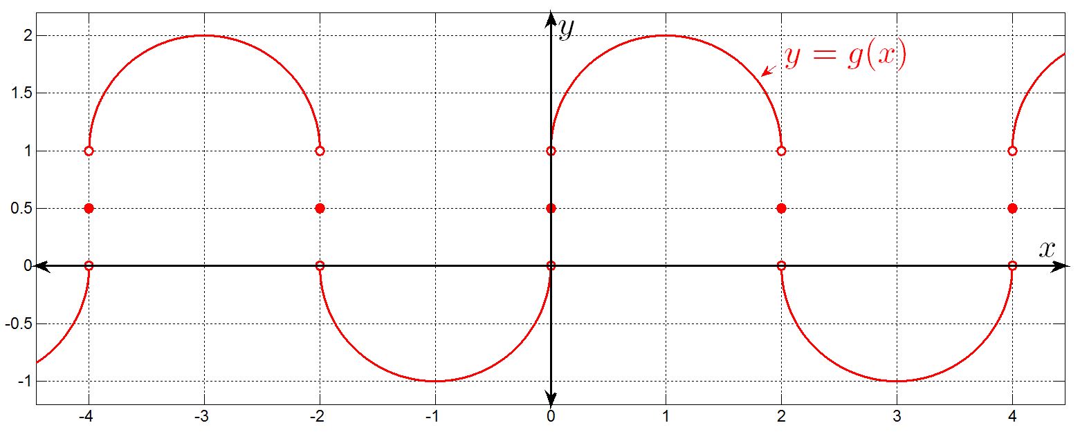 Bekijk de functie \(f(x)\) (blauw) gedefinieerd op het open interval \(\ivoc{-2}{ 2}\), en de functie \(g(x)\) (rood) waarnaar de Fourier-reeks van \(f(x)\) convergeert. In de onderstaande grafieken duidt een kleine cirkel een punt van de grafiek van de functie aan, terwijl een kleine lege cirkel een punt aangeeft dat niet tot de grafiek behoort.