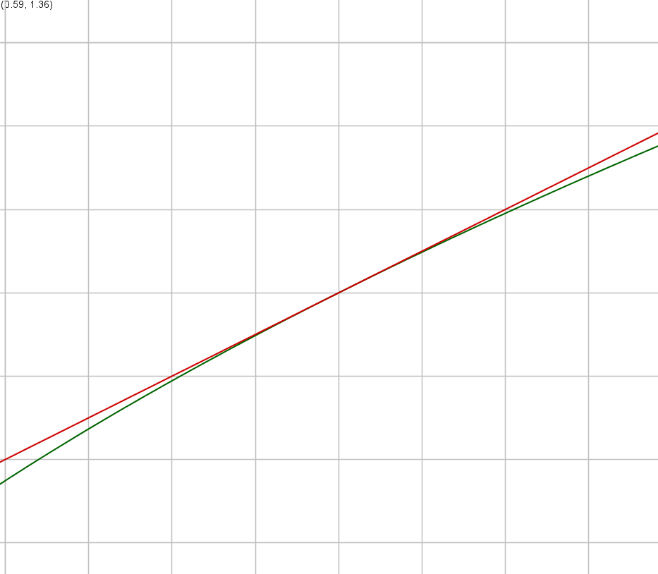 Als we inzoomen op het punt #\rv{1,1}#, dan zien we dat de grafiek van #\sqrt{x}# en de raaklijn, die gegeven is door de functie #\frac{1}{2}x+\frac{1}{2}#, in het punt #x=1# heel dicht bij elkaar liggen; zie de figuur hieronder.