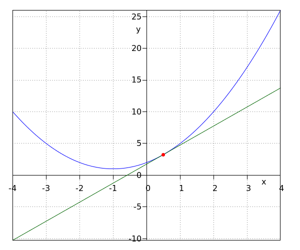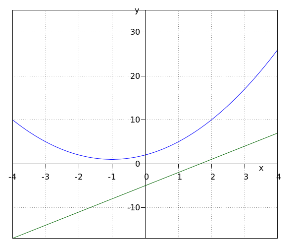 First we determine the #x#-coordinate of the intersection point by solving the equation \[a_1x^2+b_1x+c_1=a_2x+b_2\] by means of factorization, completing the square or the quadratic formula. |