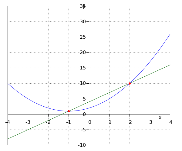 The conclusion is that the #2# points of intersection are given by: \[ \left \{\rv{ -2 , 8 } , \rv{ -1 , 9 } \right \}\tiny. \]