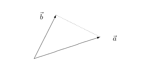 In een driehoek in het vlak waarvan twee zijden corresponderen met de vectoren #\vec{a}# en #\vec{b}# heeft de derde zijde lengte #\norm{\vec{a}-\vec{b}}#. Als de hoek tussen de vectoren #\vec{a}# en #\vec{b}# gelijk is aan #\varphi#, dan leert de cosinusregel dat